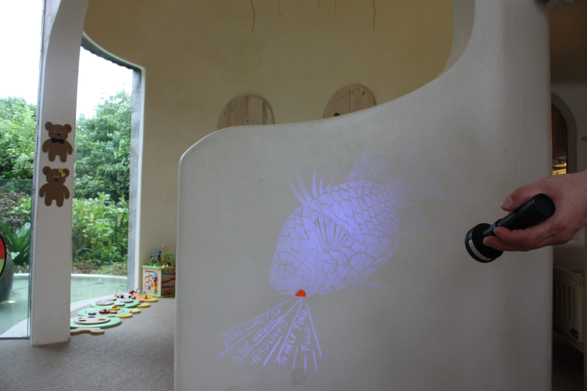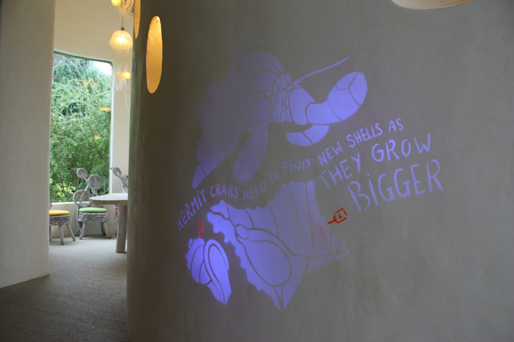 2022 – UV Discovery reveals the funny facts of the ocean through an interactive light experience. Using UV torches, visitors uncover invisible infographics and illustrations that appear like magic under ultraviolet light. Created with UV-reactive ink and custom stencils, each discovery point combines a scientific facts — such as “94% of life on Earth is aquatic” — with artistic visuals. Studio Arne Boon is the creative mind behind the concept of the interactive treasure hunt seen in the Den at Soneva Jani resort in Maldives. A sculptural bamboo charging station invites visitors to grab a torch and explore. This playful treasure hunt turns science education into an immersive journey through art, light, and marine life.