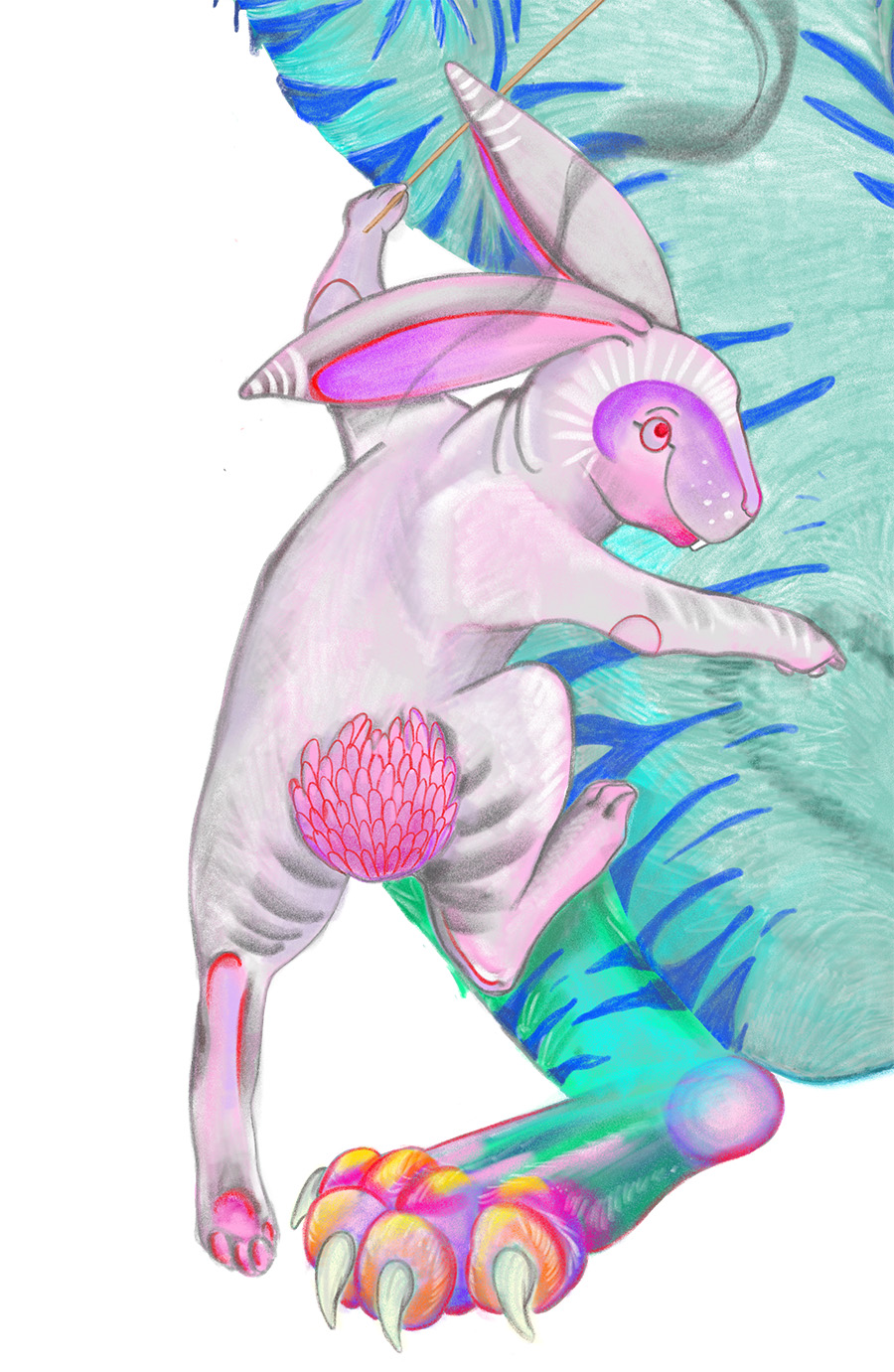 2023 – “When tigers used to smoke” is a traditional Korean saying meaning ‘once upon a time‘. The tiger in Korean folklore is a figure of moral lessons and human traits. Stories often depict tigers outwitted by clever villagers or other animals. In my illustration the rabbit helps the tiger presenting fire for his pipe because the rabbit embodies the spirit of selflessness and the importance of fulfilling one’s purpose, even at the cost of personal comfort. I have given the rabbit power through fire, but will the rabbit be eaten by the tiger? The duality represents the foundation of my creative work — connecting storytelling, multiple interpretations, symbolism, and a bit of absurd mystery. And I love tigers, so an illustration inspired by “When tigers used to smoke” was unevitable.
