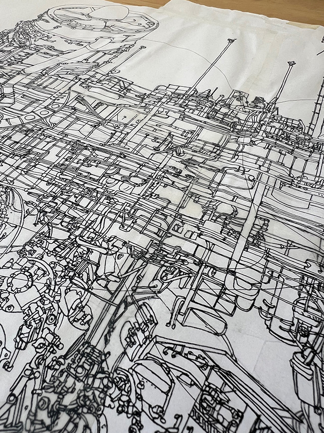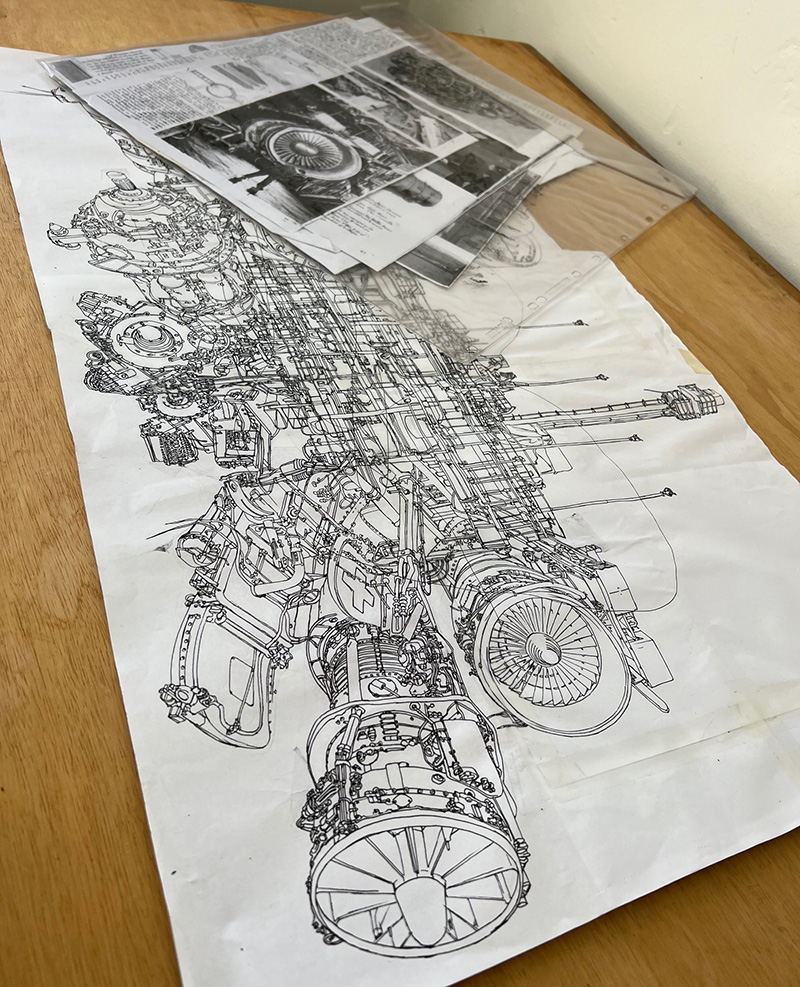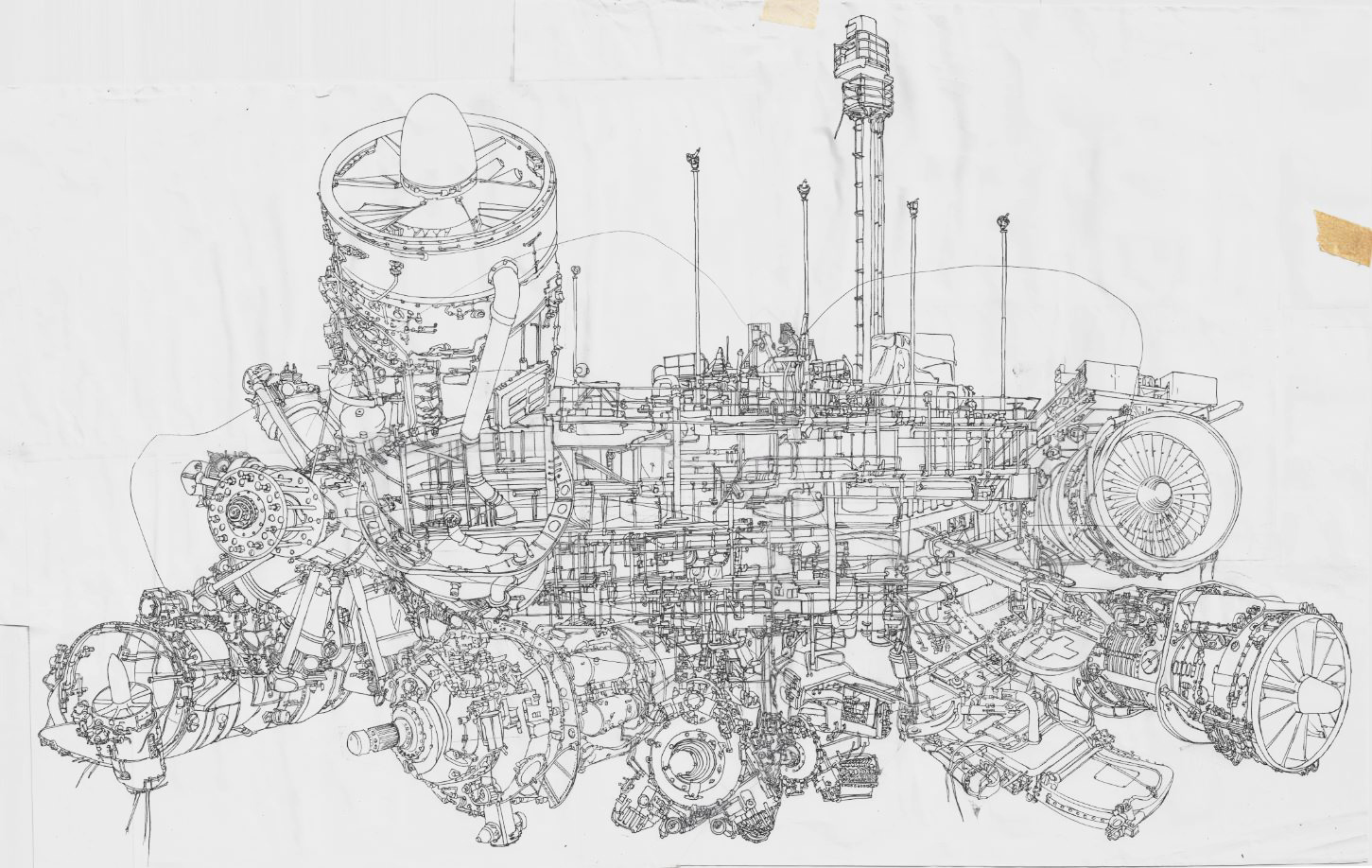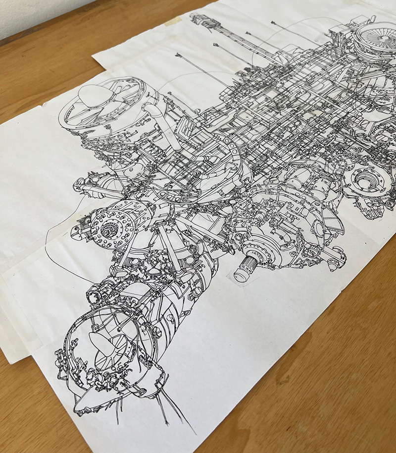 Real mechanical details were transformed into an imagined aircraft. The result is a drawing that feels both engineered and otherworldly, bridging the logic of technical drafts with the freedom of speculative design.
