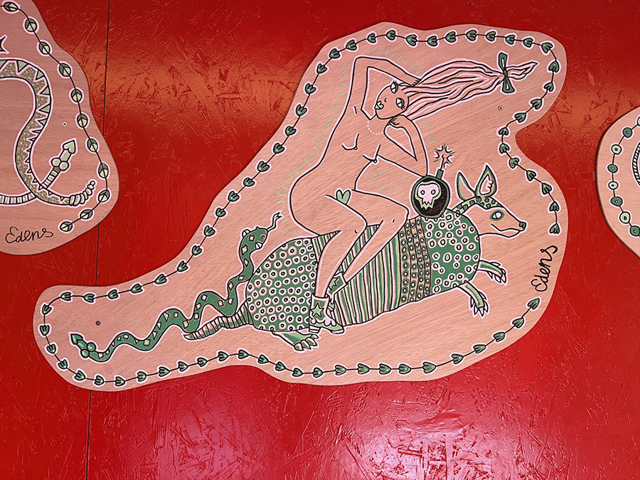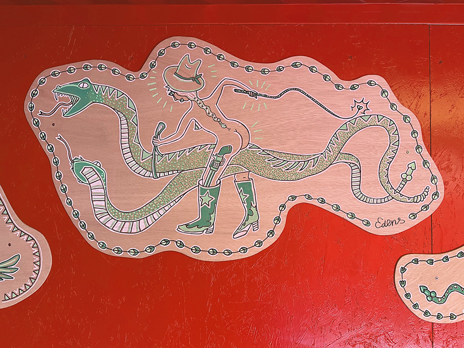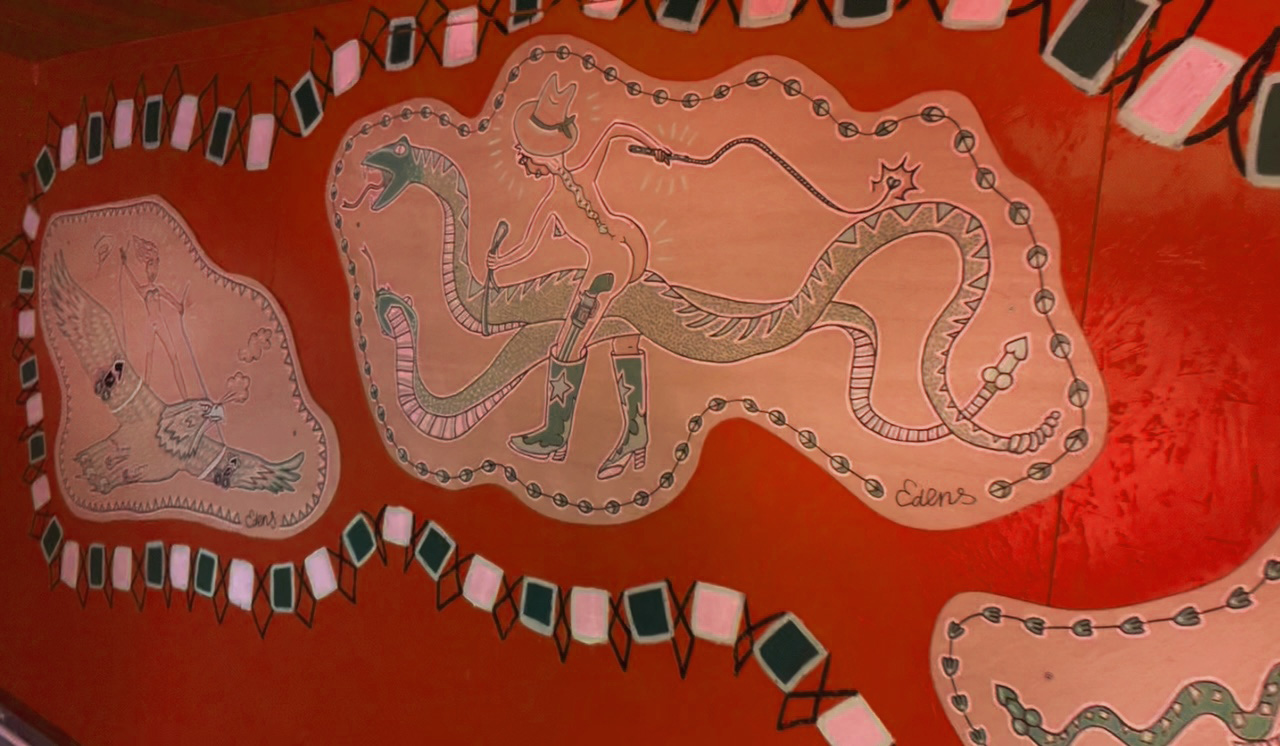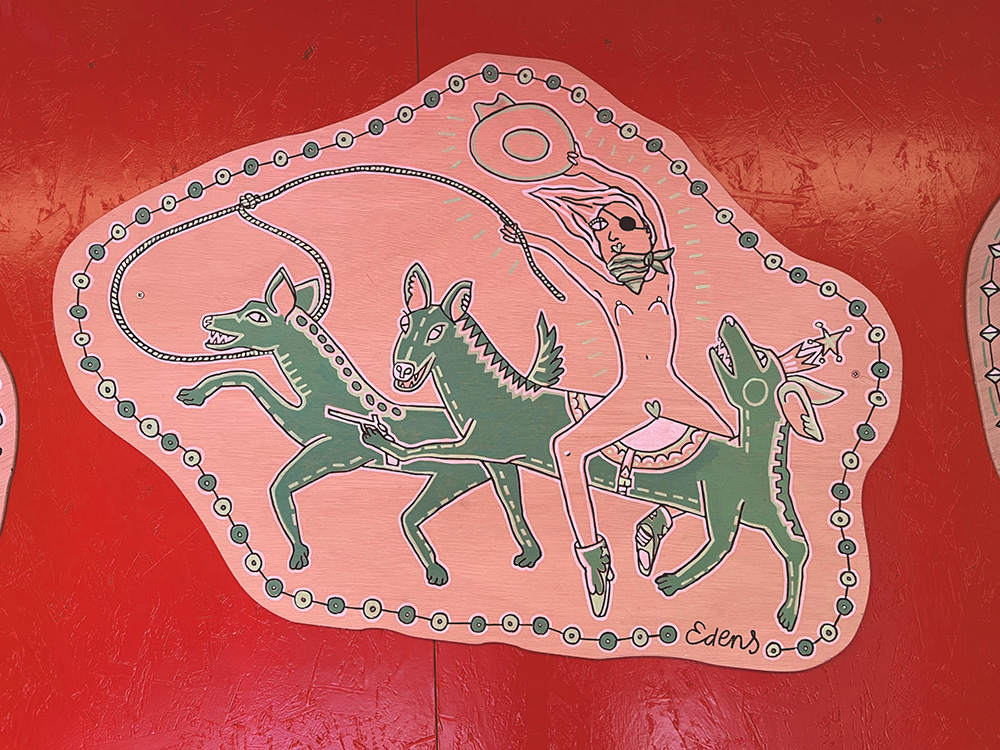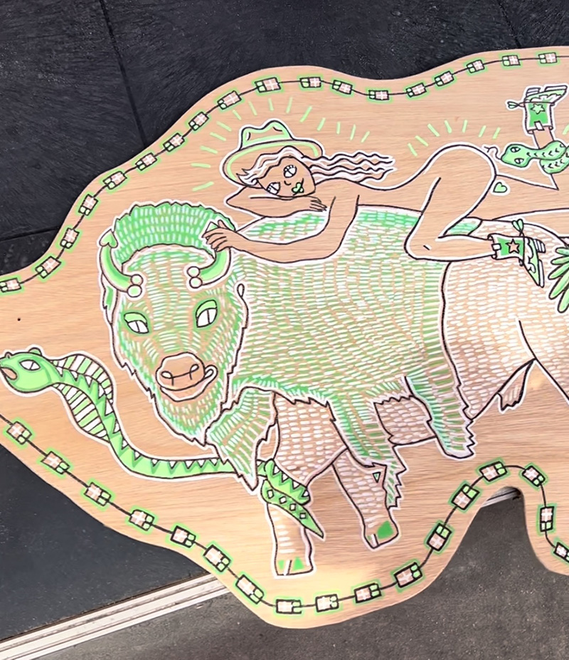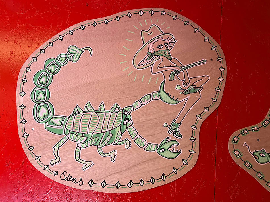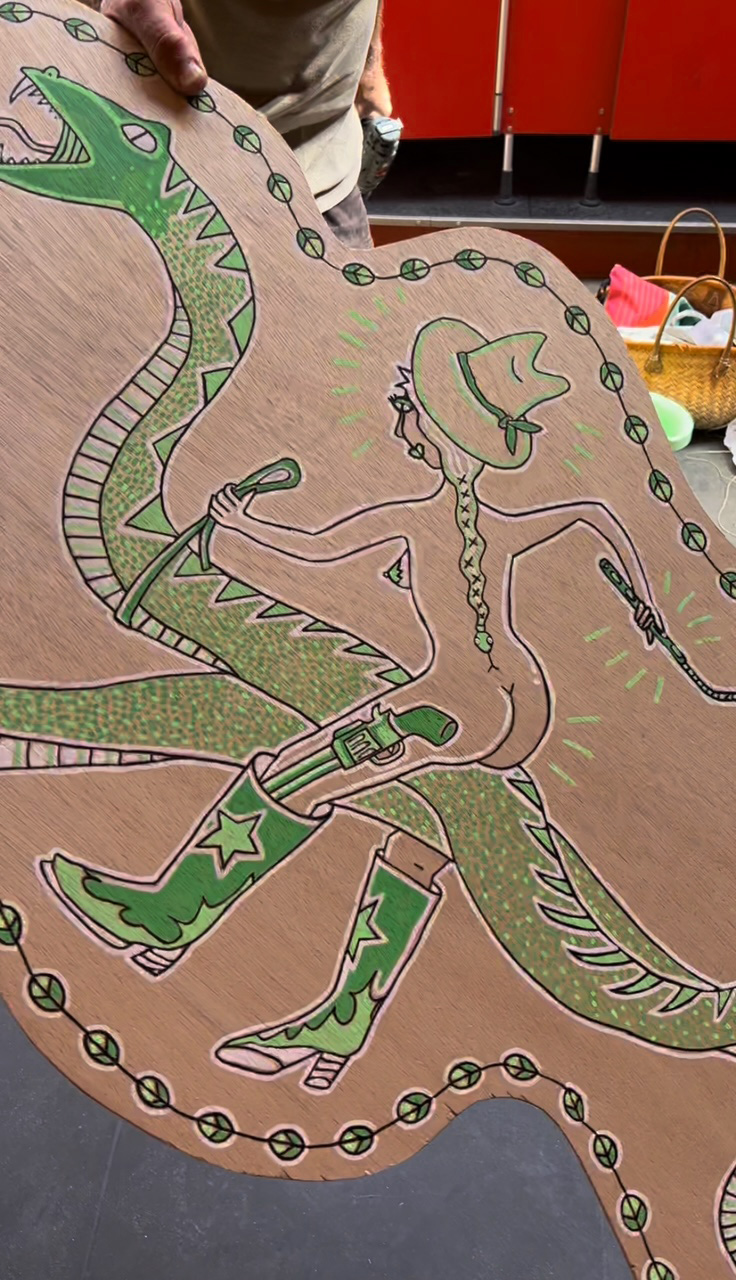 2025 – This artwork started as a hand-drawn ballpoint sketch, later transferred onto large wooden panels and finished with acrylic markers. The piece features cowgirls riding desert animals — playful, bold, and slightly provocative. The mural combines raw linework with layered colour accents, creating an image that fits the energetic, adventurous vibe of Colorado Charlie’s DJ nights.