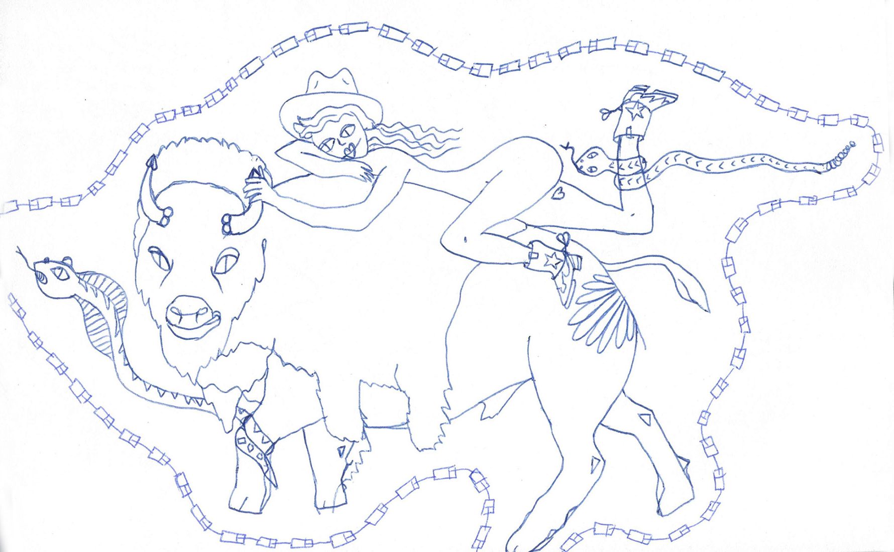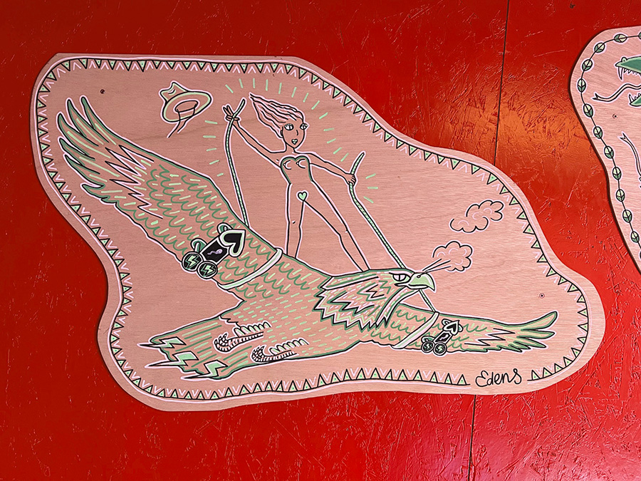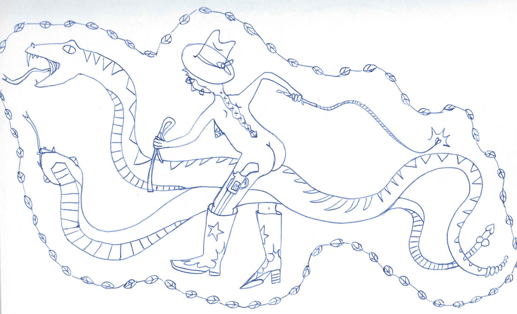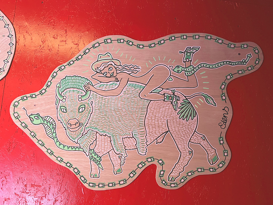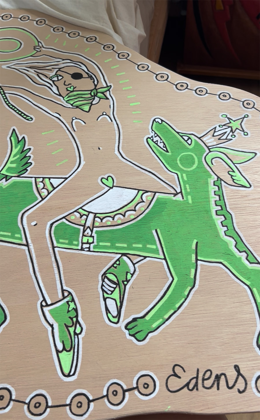2025 – This artwork started as a hand-drawn ballpoint sketch, later transferred onto large wooden panels and finished with acrylic markers. The piece features cowgirls riding desert animals — playful, bold, and slightly provocative. The mural combines raw linework with layered colour accents, creating an image that fits the energetic, adventurous vibe of Colorado Charlie’s DJ nights.