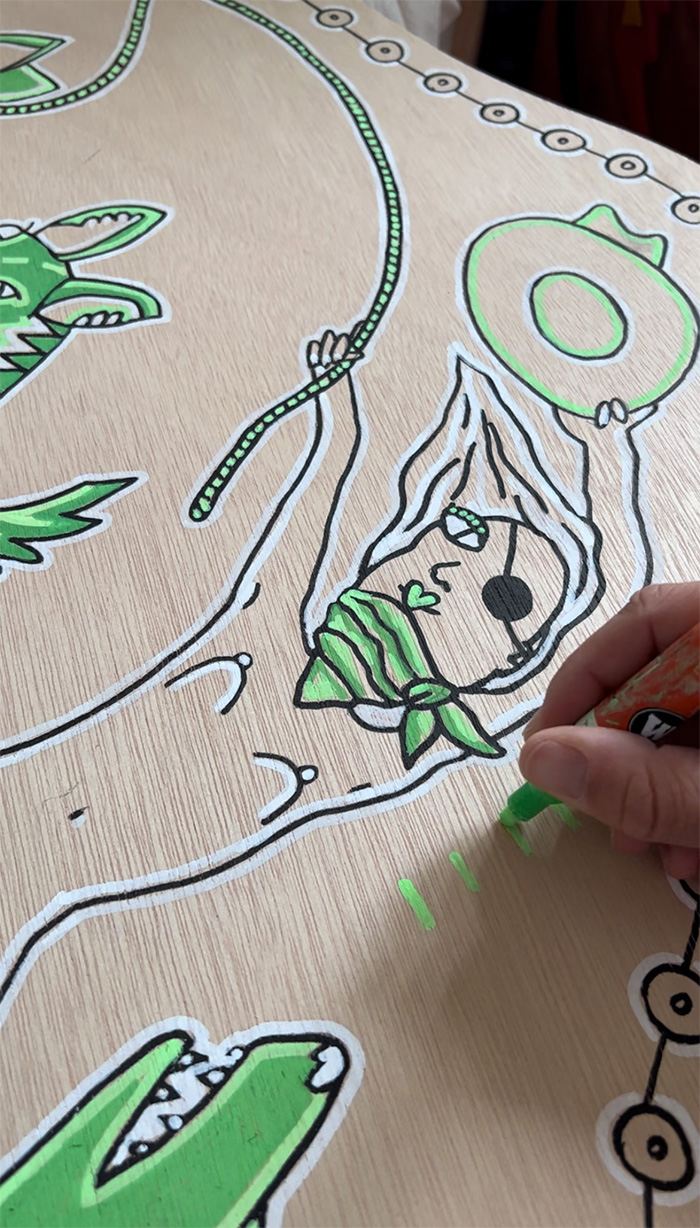 2025 – Colorado Charlie is a beach club where world-famous DJs play deep into the night. The brief: create a mural in Wild West style — gold mines, cacti, desert creatures, pistols, and a party that never sleeps. The piece had to live both day and night, so I used white for daylight contrast and fluorescent green to glow under black light after dark. Drawn freehand with acrylic markers on wood — no sketch, just flow — the mural grew organically, with input from the club’s crew to make it a piece that belongs to everyone who works and parties there.